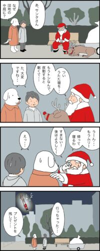 マンガ「クリスマスの困ったさんたち」クリスマス・イヴの夜、団地の中庭で眠っているサンタクロースを見つけたコマリとコマリーヌは…。